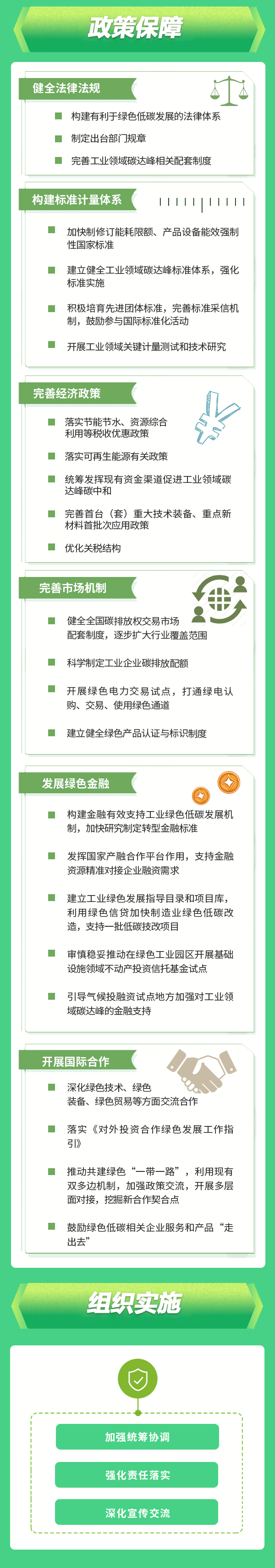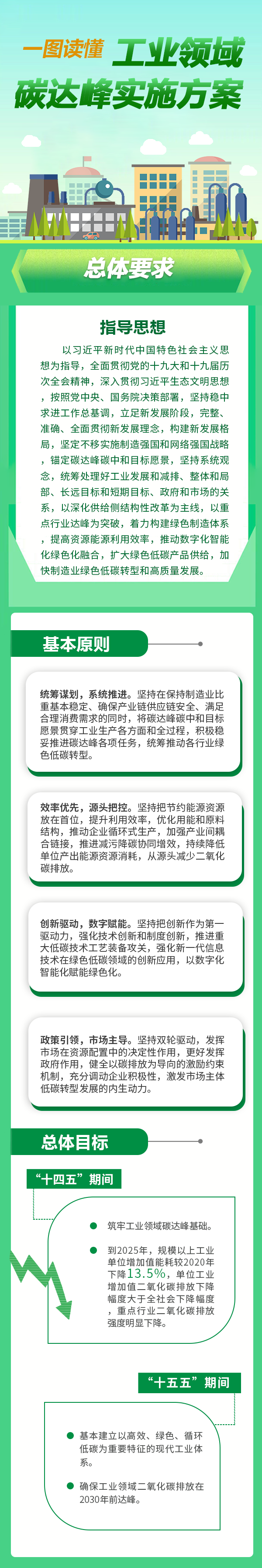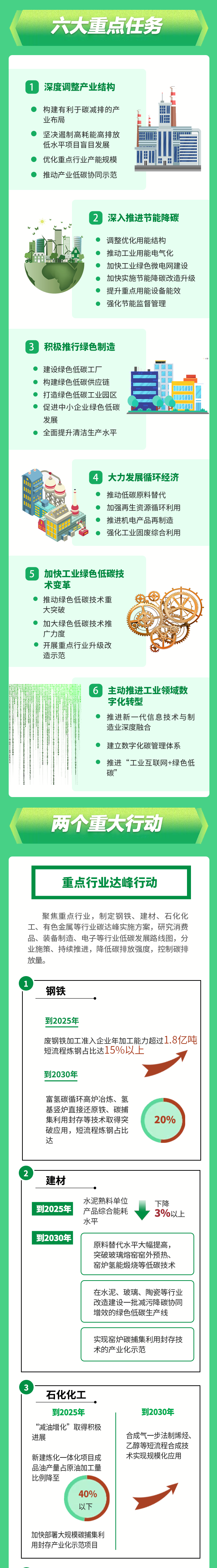 工業(yè)和信息化部、國家發(fā)展改革委、生態(tài)環(huán)境部印發(fā)《工業(yè)領(lǐng)域碳達(dá)峰實(shí)施方案》(以下簡稱《方案》),其中提出,“十四五”期間,產(chǎn)業(yè)結(jié)構(gòu)與用能結(jié)構(gòu)優(yōu)化取得積極進(jìn)展,能源資源利用效率大幅提升,建成一批綠色工廠和綠色工業(yè)園區(qū),研發(fā)、示范、推廣一批減排效果顯著的低碳零碳負(fù)碳技術(shù)工藝裝備產(chǎn)品,筑牢工業(yè)領(lǐng)域碳達(dá)峰基礎(chǔ)。