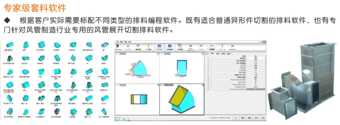 各種工業異形件加工;各種通風管道彎頭切割加工(配合專用的風管選型與編程軟件,輕松實現風管切割加工),各種薄板金屬制品的切割加工(如:不銹鋼廚具、炊具),廣泛應用于各個行業的金屬薄板切割加工。
